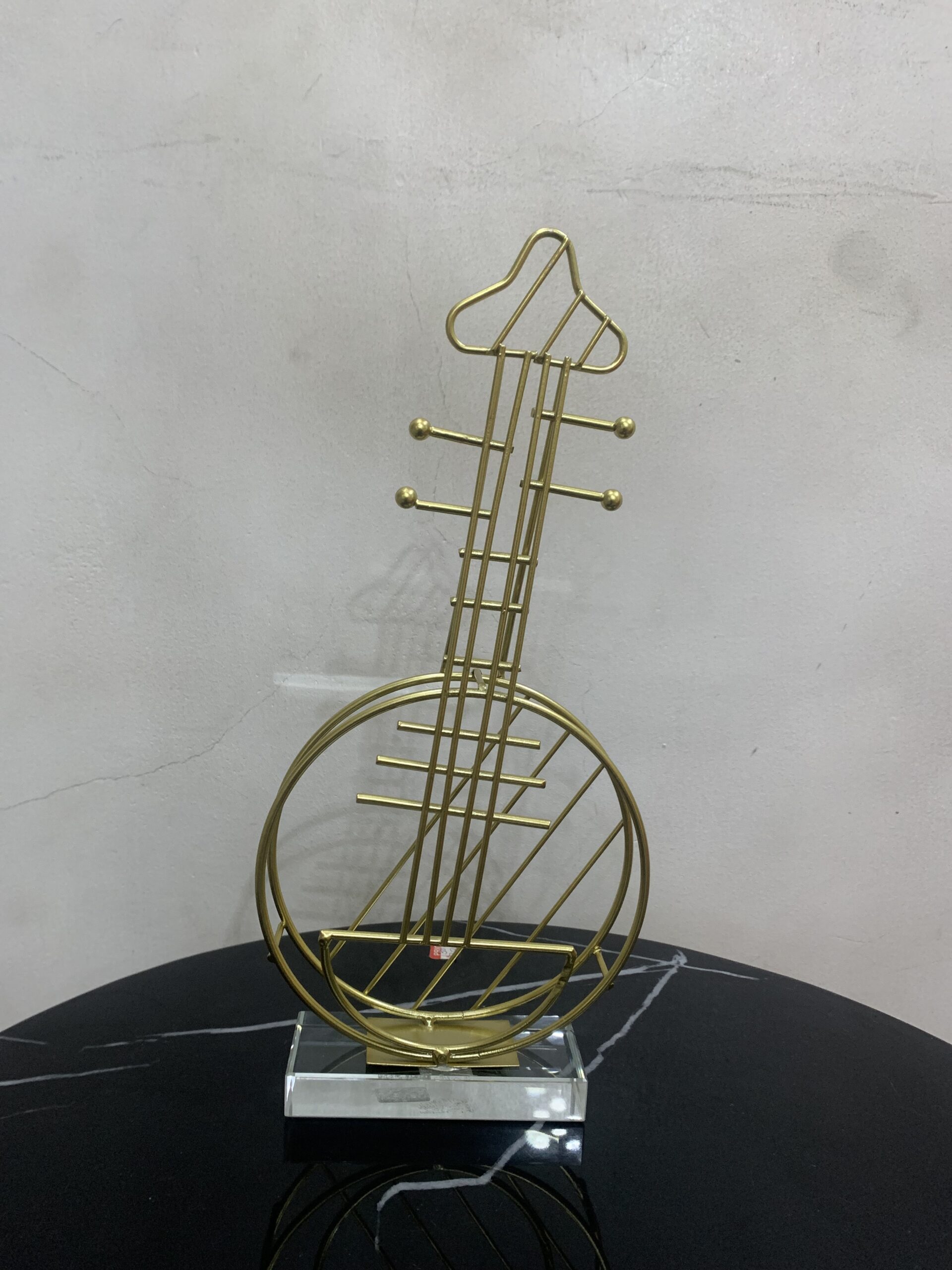 Make a statement in your home or office with this show-stopping decorative metal guitar on a glass stand. The sleek, modern guitar is crafted from high quality metal and features intricate details that music lovers will adore. Perfect for music enthusiasts, collectors, and anyone looking for a conversation-starting decorative piece